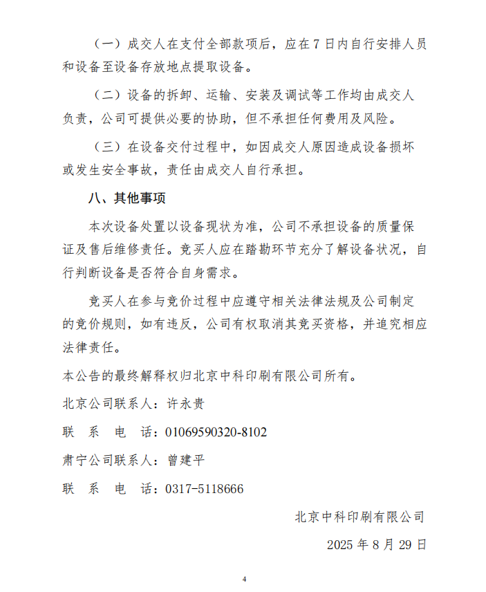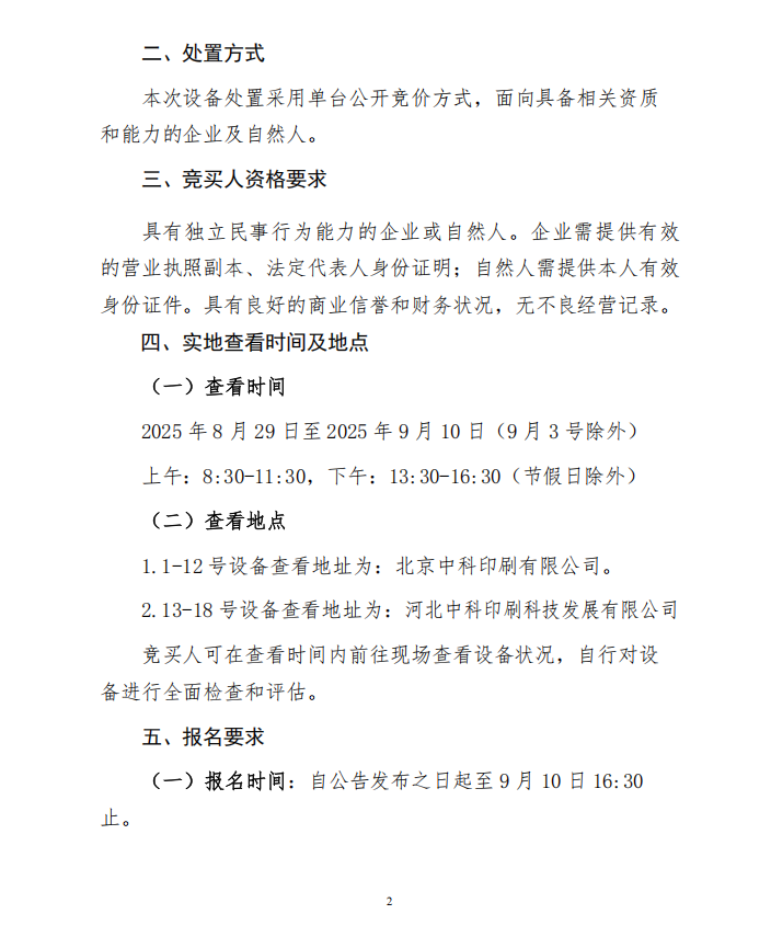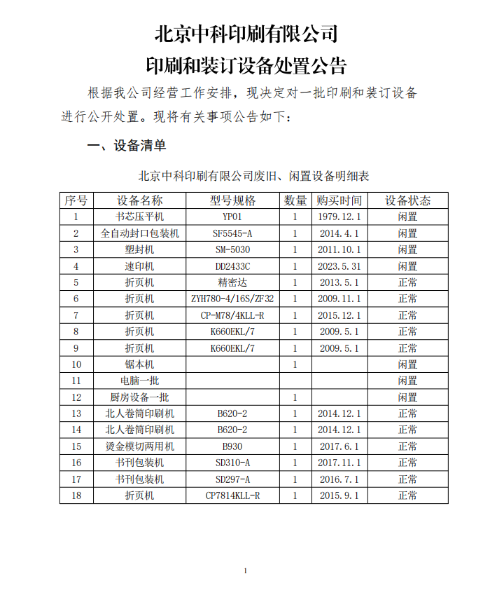 北京中科印刷有限公司 印刷和裝訂設備處置公告