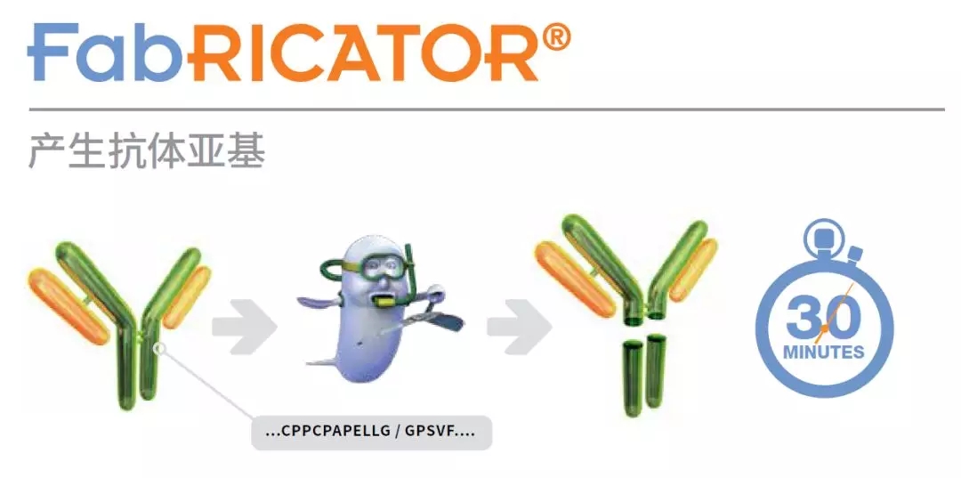 FabRICATOR? (IdeS)is a unique cysteine protease that cleaves IgG at a single amino acid site below the hinge region. The digestion reaction can be completed in only 30 minutes, and no condition optimization is required.