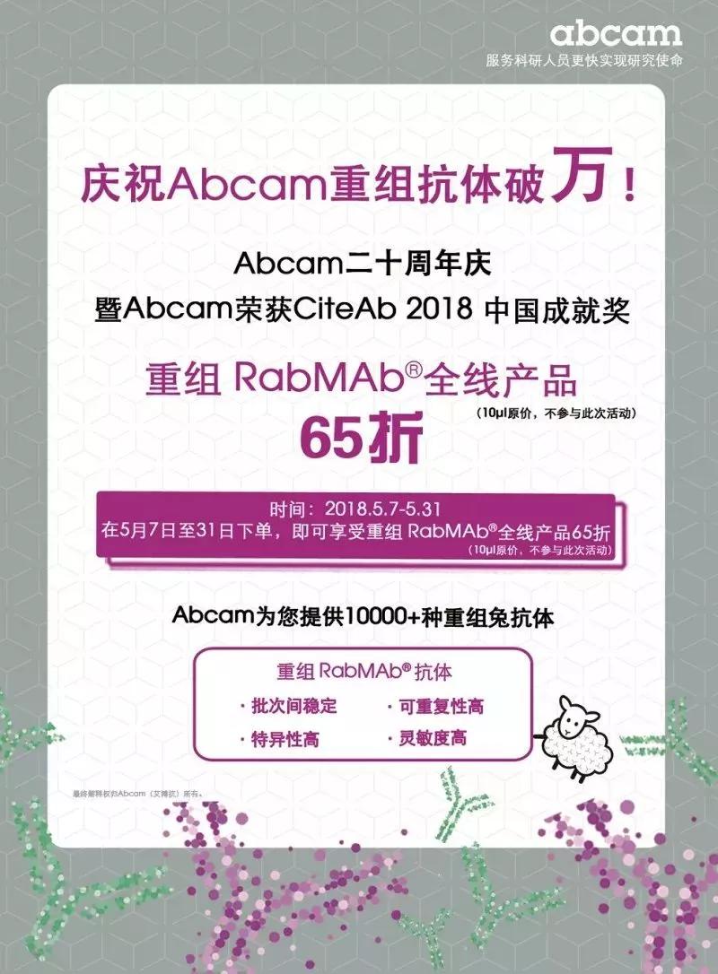 The second wave of Abcam's 20th Anniversary is in full swing. In order to give back to the new and old users who have long supported Abcam, the RabMAb? (abcam patented rabbit monoclonal antibody) will be reorganized as low as 65% (except for 10ul in small packages)! The decline has never been seen before! Help accelerate your scientific discovery!