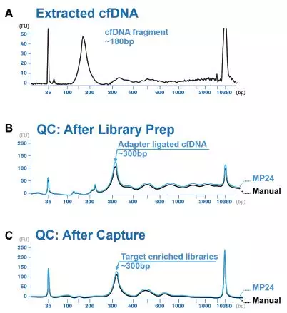 Agilent Bioanalyzer數據展示了采用MagNA Pure 24 Total NA Isolation Kit和MagNA Pure cfNA Buffer Set聯合使用可更好的對小片段進行分離和富集。