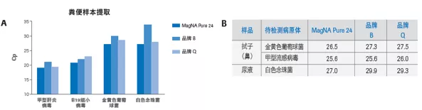 A)糞便是極具挑戰性的樣本,而 MagNA Pure 24系統在4個待檢測病原中均表現較好。