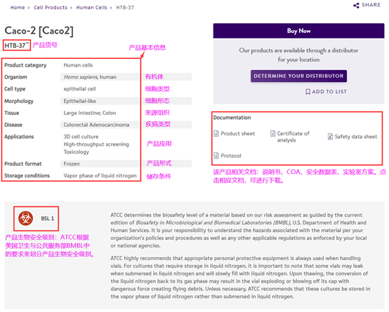 在產品詳情頁面上,可在頁面左上角看到產品的基本信息,如產品的名稱,貨號,及其他基本信息;可在頁面右上角看到產品說明書、COA、安全數據表、實驗室方案(如有)等相關文檔;可在頁面中看到產品的生物安全級別,即BSL等級。