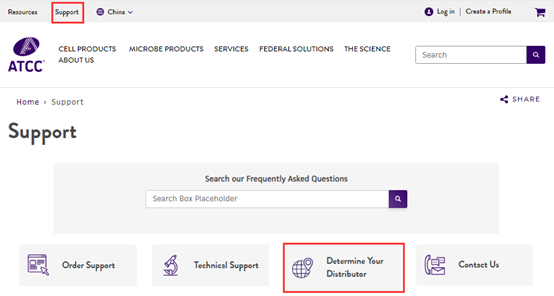 打開ATCC官網,點擊Support,然后點擊“Determine Your Distributor”。