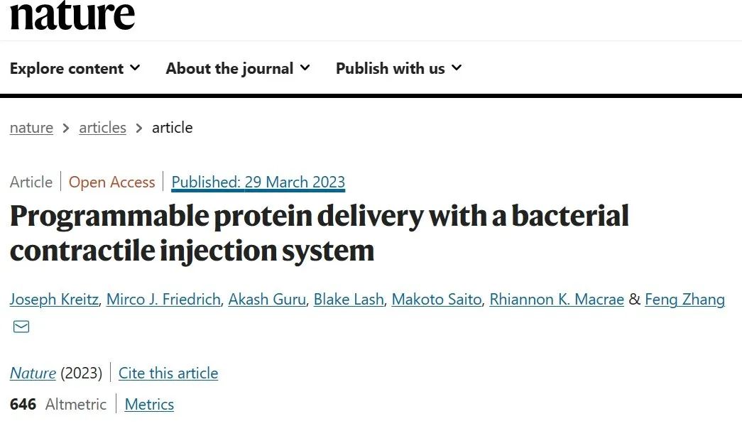 2023年3月底,CRISPR的先驅者,華人科學家張鋒教授及其團隊在 Nature 期刊發表了題為:Programmable protein delivery with a bacterial contractile injection system 的研究論文。