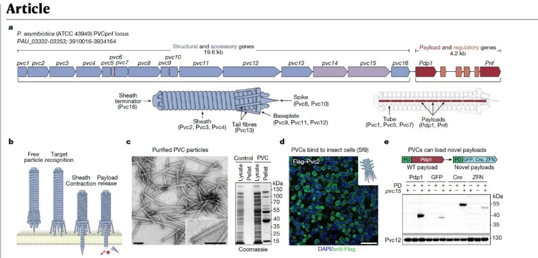 在這項最新研究中,張鋒團隊首先選定了eCIS的一個亞型——Photorhabdus virulence cassette(PVC)。PVC由一個約20kb的操縱子組成,包含16個核心基因(pvc1-16),以及下游的有效載荷Pdp1和Pnf。研究團隊發現,PVC有效載荷蛋白的N端高度無序區域是其“包裝結構域”,只要將其與想要遞送的蛋白(例如GFP)融合,就能將其加載到PVC復合體中。