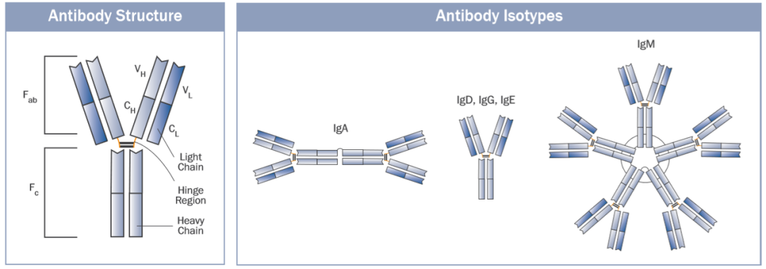 抗體結構與抗體類型示意圖