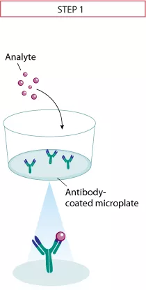 第一步:向包被有捕獲抗體的微孔板中加入樣品或標準品,孵育使分析物與包被的抗體結合,將未結合的其他分子清洗掉。