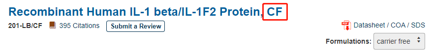 CF,是 Carrier Free 的意思。一般來說,為了對重組蛋白的結構及活性進行保護,我們會在蛋白產品中添加牛血清白蛋白(BSA)作為載體蛋白。但考慮到 BSA 會對某些實驗造成影響,我們又研發出不含載體蛋白(BSA)的產品,即 Carrier Free 蛋白。