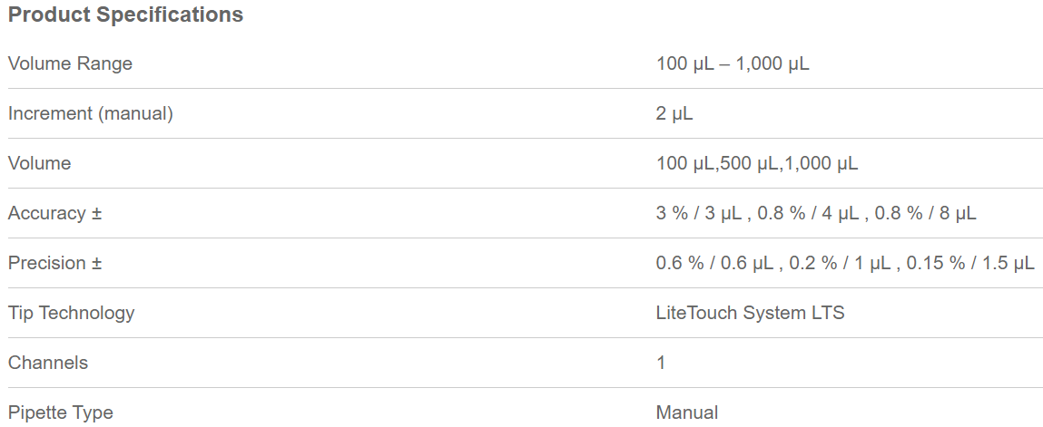 Pipet-Lite? XLS+ manual single-channel pipette, 100-1000 μL, uses LT? LiteTouch? tips. Accurate and precise, ergonomic, autoclavable liquid end, rugged and durable (L-1000XLS+)