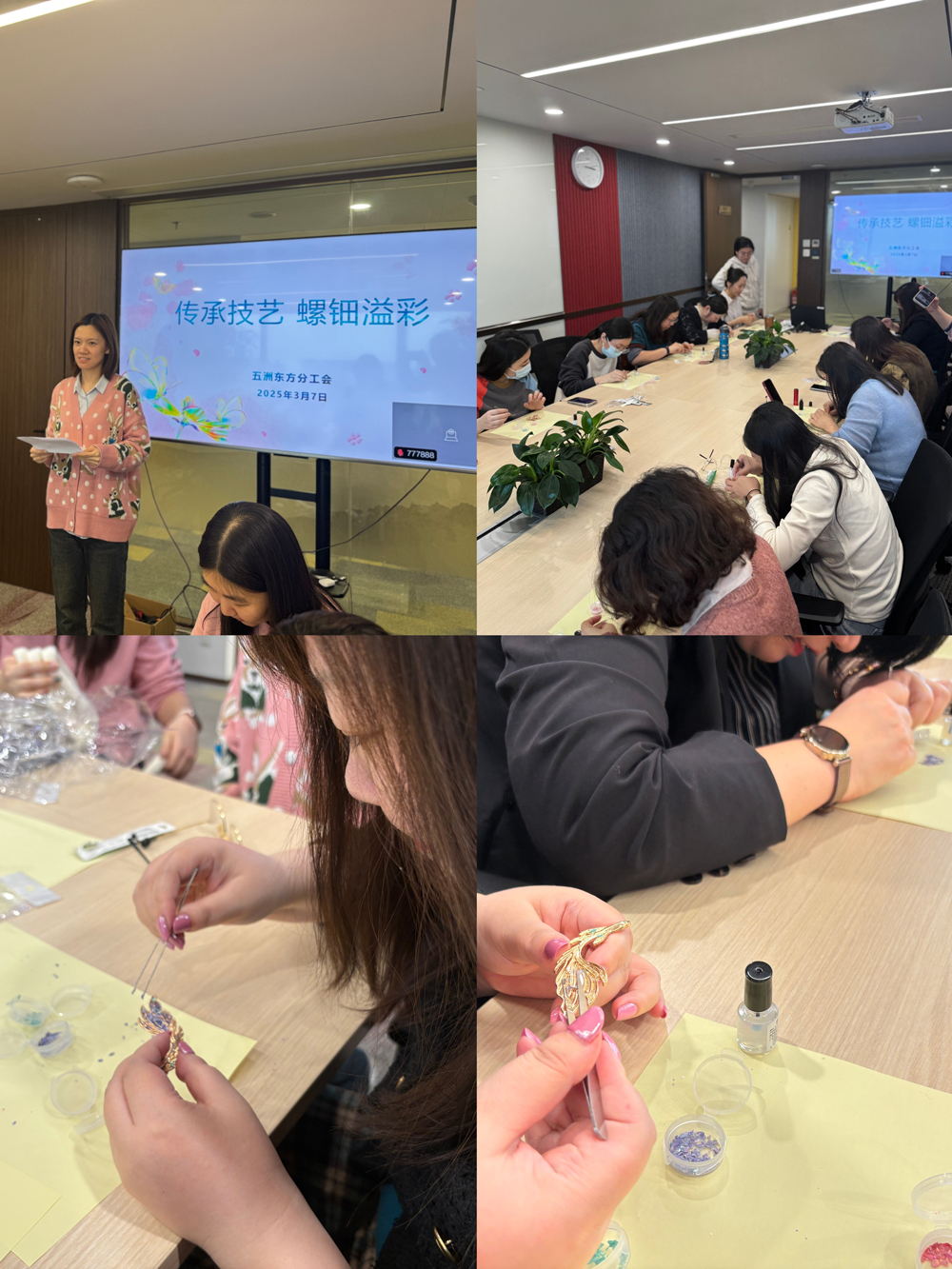 ??為進一步弘揚中華民族優秀傳統文化,感受非遺物質文化遺產的獨特魅力,五洲東方女職工開展了“傳承技藝,螺鈿溢彩”主題活動。在充分了解螺鈿的歷史淵源、文化內涵和制作工藝,欣賞了獨特精美的螺鈿作品后,女職工們迫不及待動手體驗,選料、打磨、鑲嵌,薄薄的蚌殼在巧手打磨下呈現出絢麗的光彩,一件件獨一無二的螺鈿作品在大家手中孕育而生。大家相互交流制作心得,臉上洋溢著喜悅,心中對非遺文化的熱愛與保護意識也悄然滋長。